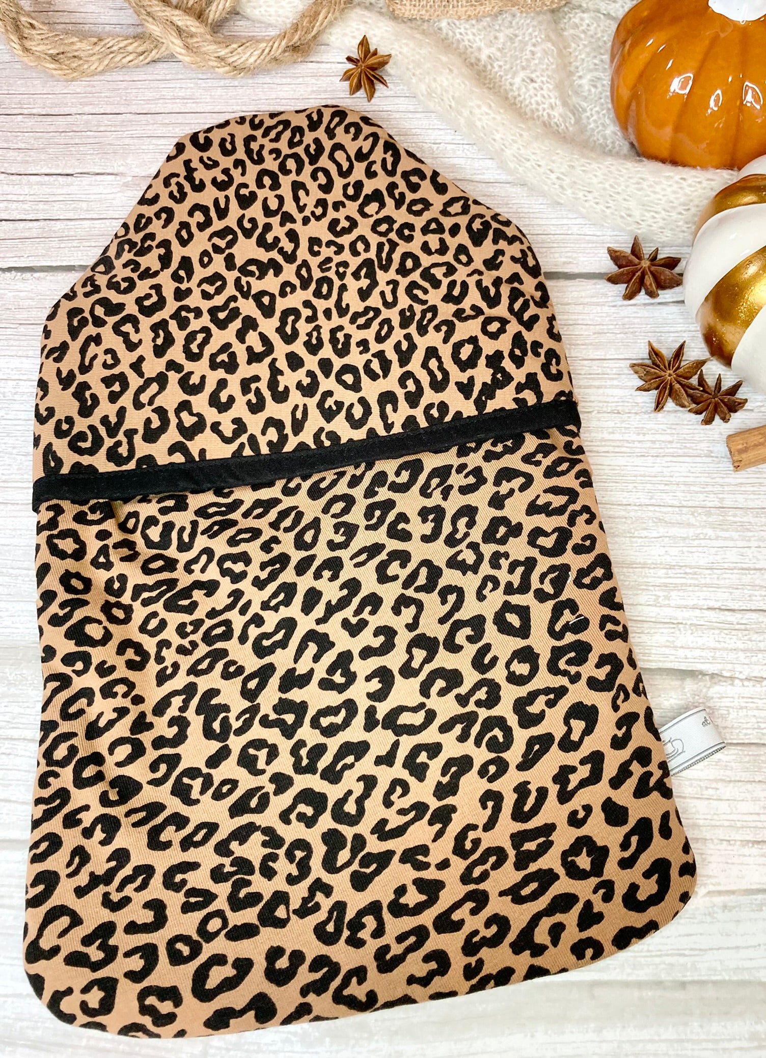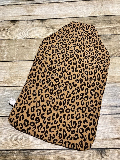 Soft Leopard hot water bottle cover - made from natural bamboo wadding and lined with cotton.