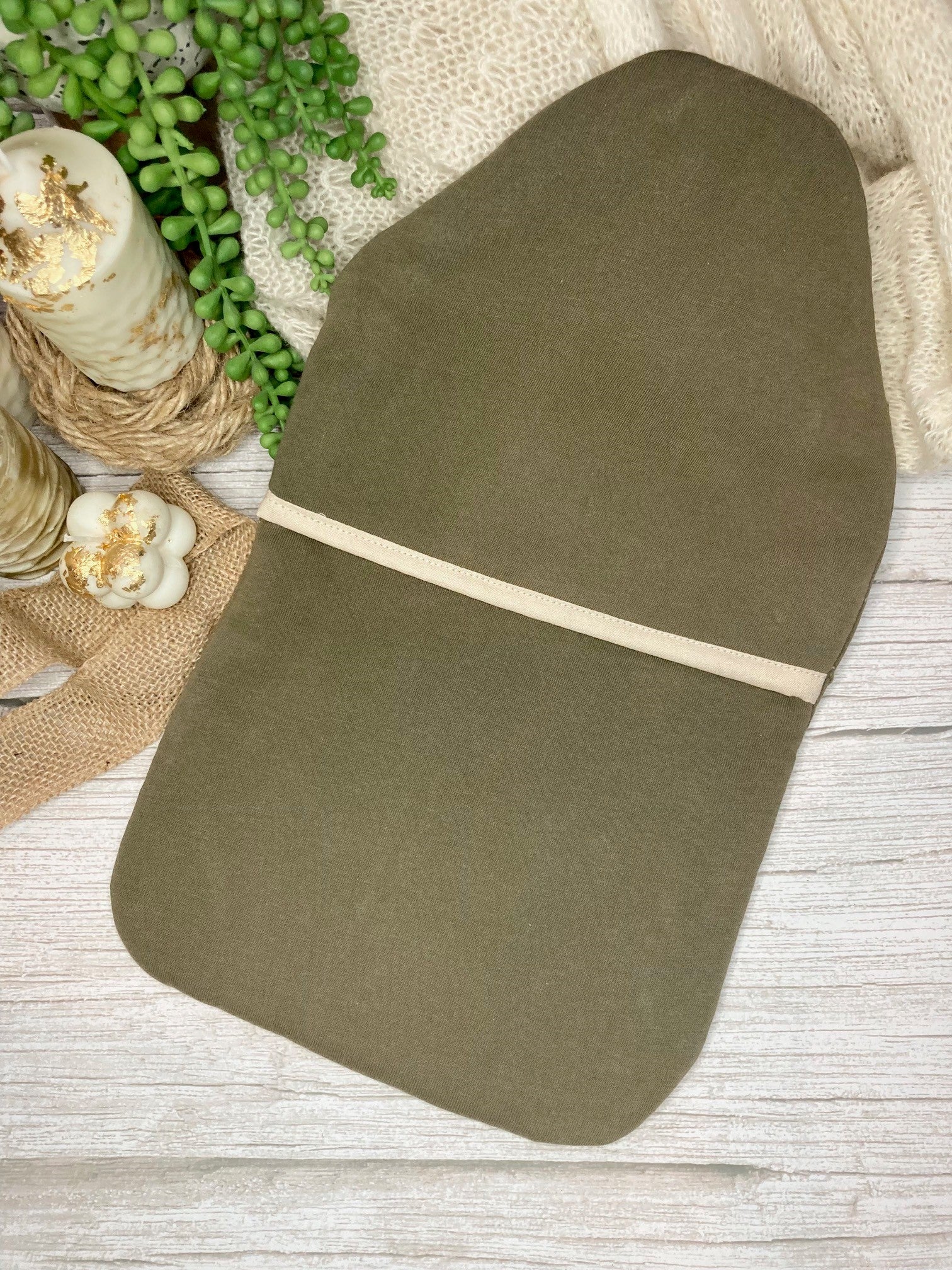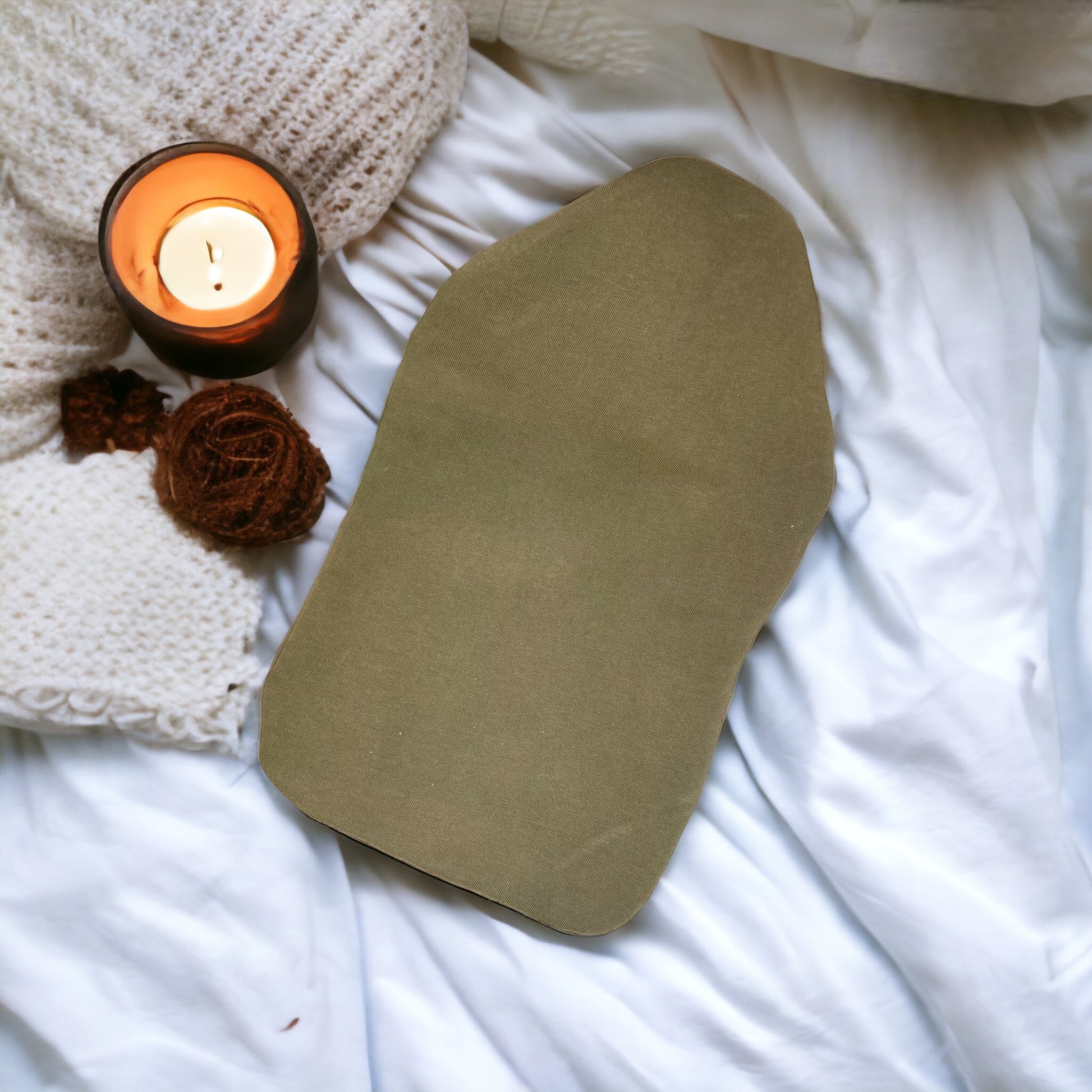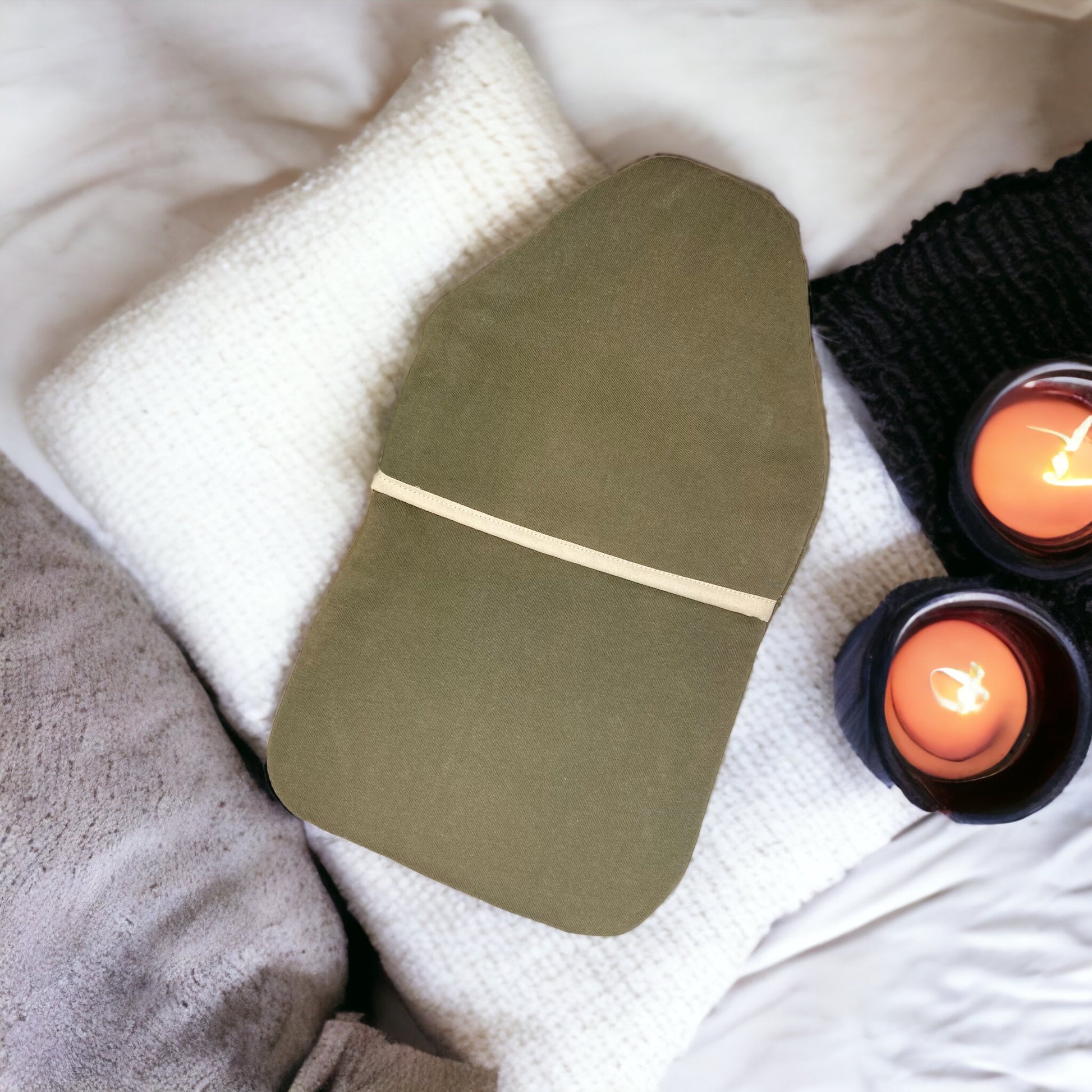 Soft olive green recycled cotton hot water bottle cover with bamboo wadding.