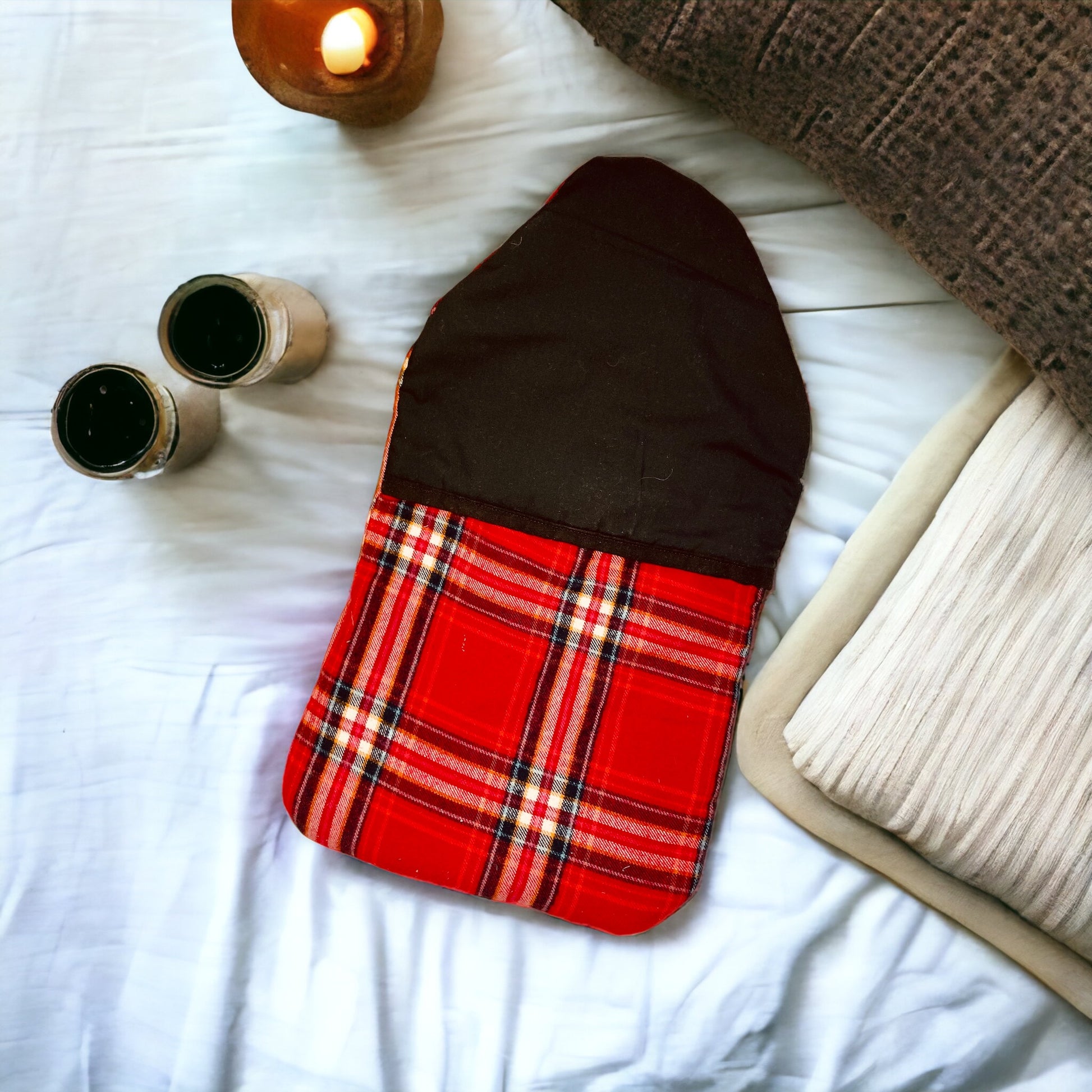 Soft red tartan recycled cotton hot water bottle cover with bamboo wadding and a black cotton lining.