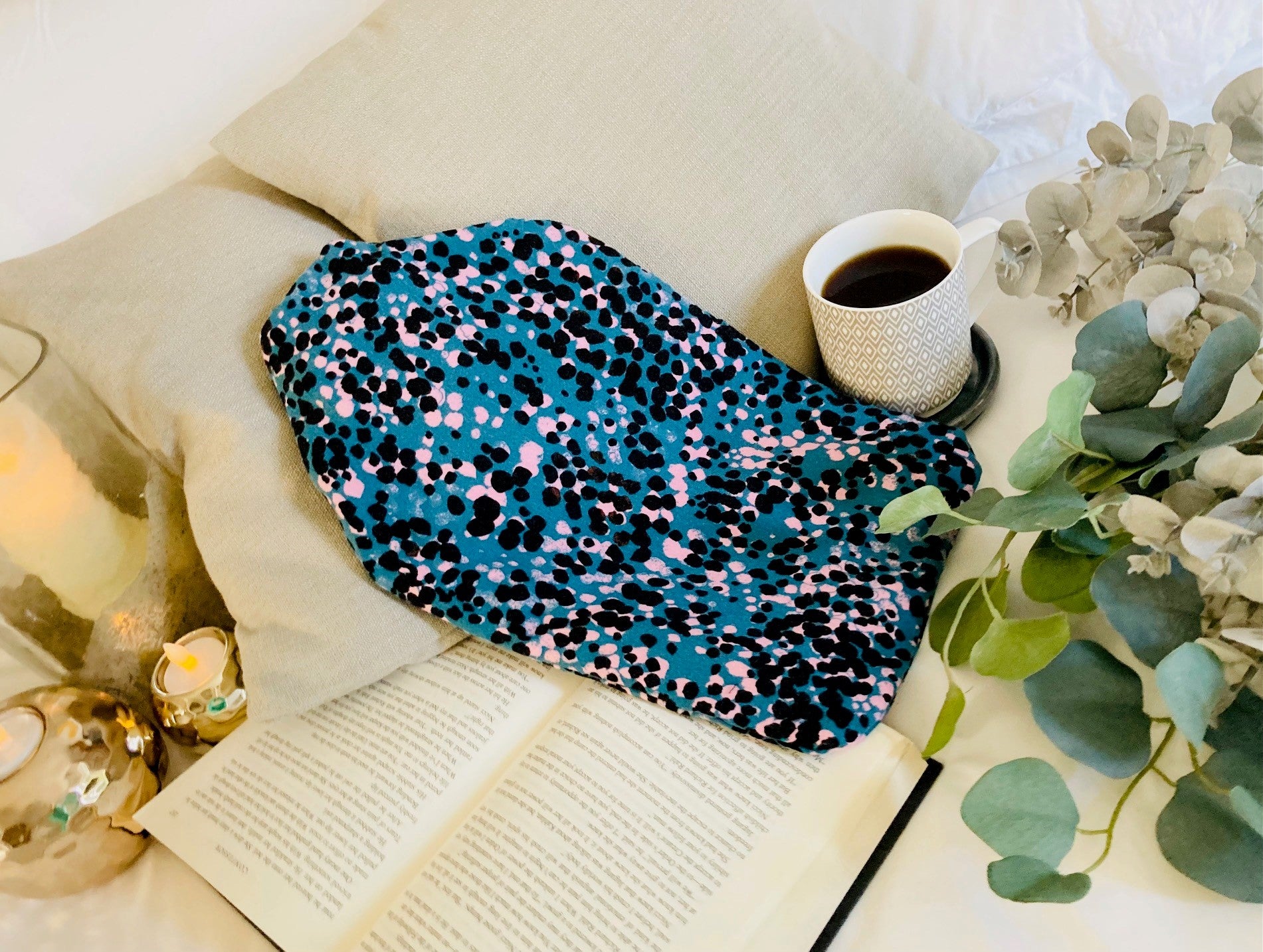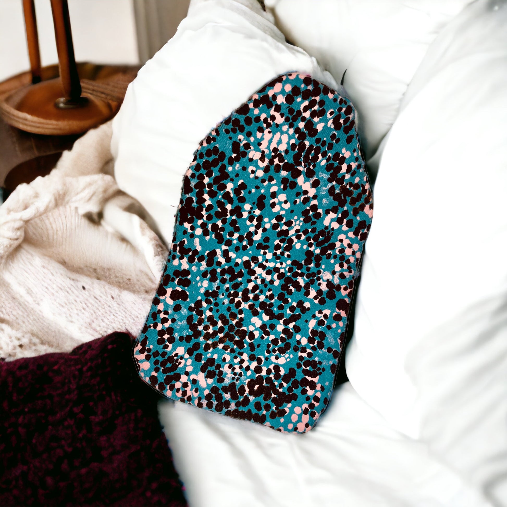 Soft turquoise recycled cotton with pink and black splodges hot water bottle cover, made with bamboo wadding.